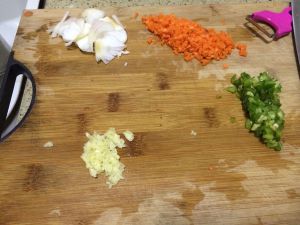 萝卜丝,蒜,洋葱,青椒,全部切碎备用,记住不要切丁,要切碎