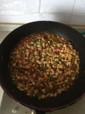 在加入青菜和牛肉酱,翻炒,加入盐,胡椒粉,继续翻炒,