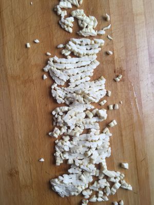 热锅凉油,打入鸡蛋液,稍微凝固后,用铲子铲成小块,盛出备用