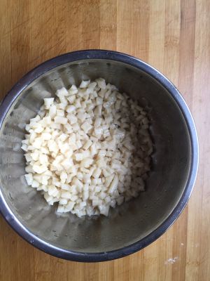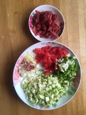 柿子椒、火腿、西红柿切丁,洋葱、卷心菜切条。