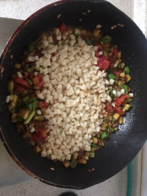 另起锅热油,放入洋葱爆香后,放入西红柿丁,小火让它咕嘟一下。然后让入卷心菜和柿子椒一起炒。也就炒个一两分钟就好了,把菜堆到锅的一侧,然后鸡蛋打碎倒入锅里开始煎鸡蛋,鸡蛋熟了以后和菜一起炒,最后放入火腿丁。