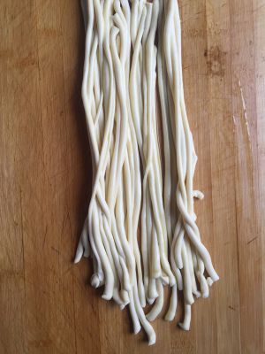 锅中添加适量水,烧开,下手擀面,锅开两次,点两次凉水,出锅,不可煮太久
