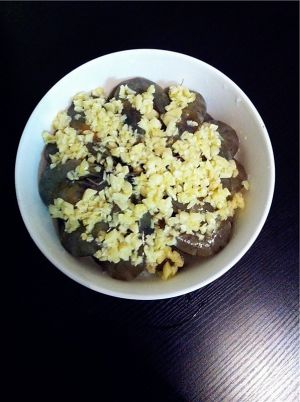 大蒜剁成蒜末,取三分之二,入油锅煎至金黄,与剩下的三分之一拌匀