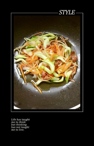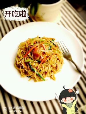 过完冷开水的面跟配菜一起翻炒,加酱油,生抽,加点点盐(根据自己口味放)拌匀,最后放葱、香油炒下出锅