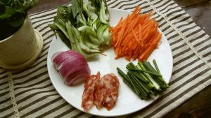 放油把香肠炒香,再炒红萝卜最后炒青菜。加点点盐调味。