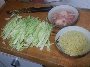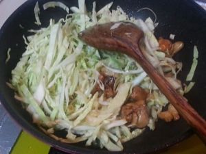泡面煮到八成熟,鸡肉切大块,圆白菜切条
