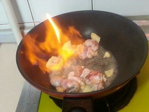 热锅凉油,下姜片,炒香后下鸡肉块,烹入50毫升高度白酒,用火焰让鸡肉迅速加热,等火焰熄灭,下一小勺盐巴