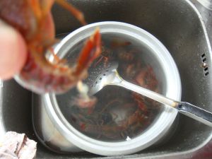 用姜葱水将活虾煮熟,开锅后2分钟即可,然后将小龙虾头部去掉放入盘内