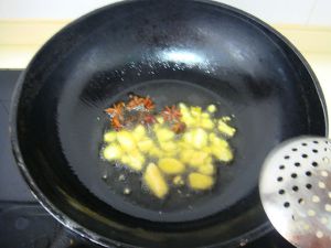 用花椒跟干辣椒爆锅,爆好的花椒跟辣椒盛出留下油。喜欢麻辣的可以多放材料