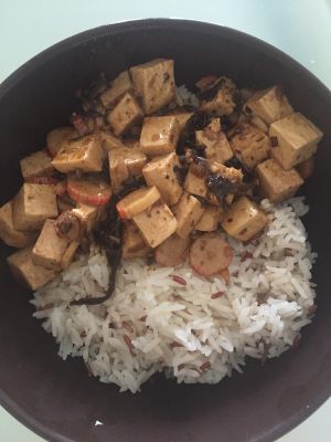依次放入木耳,火腿,豆腐,倒入酱汁,搅拌均匀,闷3分钟