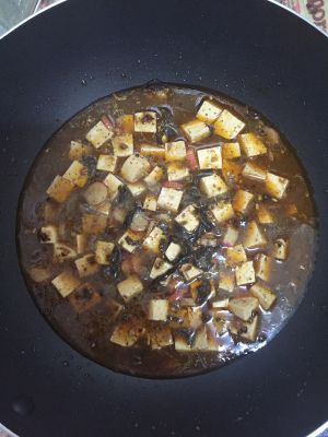 加入热水,放入切好的豆腐,依次加入盐,糖,酱油,盖上锅盖蒸煮五分钟。