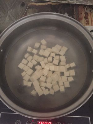 热水加盐,豆腐先切块抄一下,避免等下煮烂
