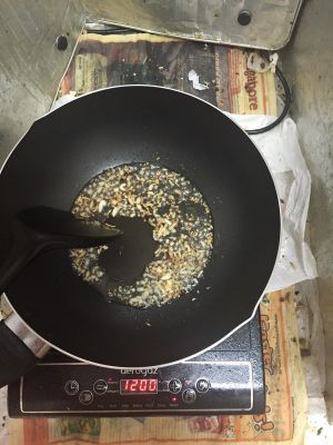 油锅烧热后加入剁椒进行翻炒,出现香味以后加入葱姜蒜依序翻炒。