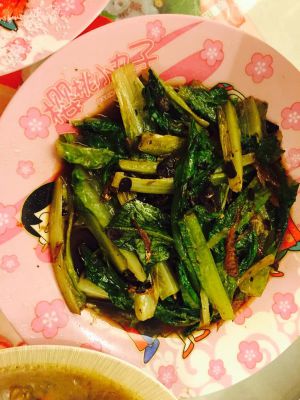 锅内油热,放入豆豉、豆豉鱼撕条放入,最后加入油麦菜翻炒