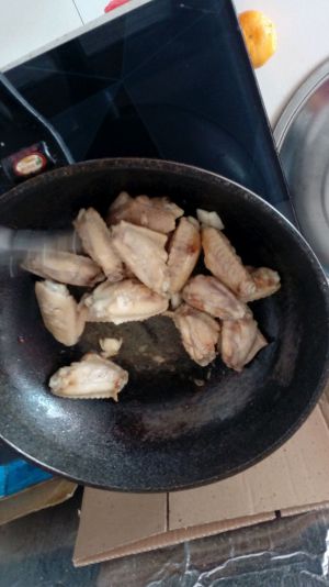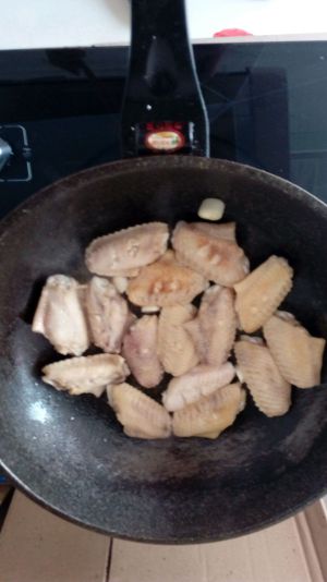 锅里放油,爆香配料,然后放入鸡翅翻炒,盖上锅盖让鸡翅皮稍稍变焦,这样口感更佳