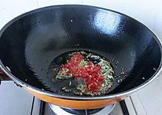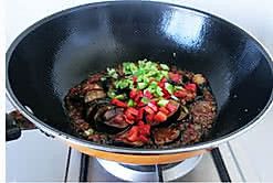 锅中留底油,下 葱、蒜、姜末炒香,再放入泡辣椒碎炒出香味后,放入茄子