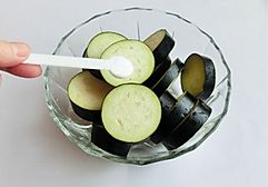 茄子切片,放少许盐拌匀,茄子腌制0分钟左右,挤出水份