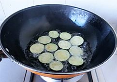 烧热砂锅,放入橄榄油,烧至六成热,投入茄条炸约1分钟至熟,捞出滤去油分。