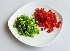 将茄子,青椒,西红柿切丁(这里误将茄子切成天条)葱姜蒜切好备用。