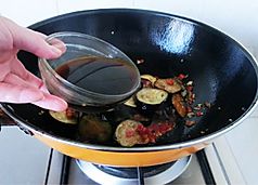 在原锅里加肉末炒到变色,加葱花、姜末、辣椒油,炒匀后调入鸡精、料酒、酱油和醋,再加入茄条和汤(或清水),焖至酥烂。