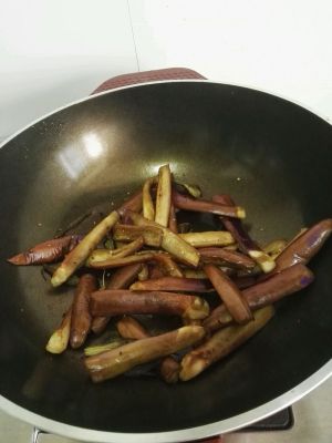 小火,不放油,干煸茄子。不停翻动,我用的不粘锅。