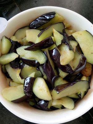锅内放油,小火煎茄子,煎软,盛出备用