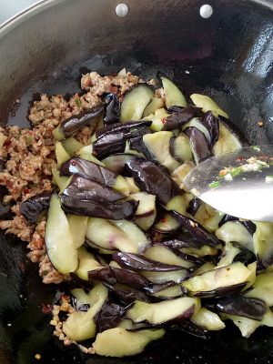 肉末炒均匀后,加入茄子,转大火炒