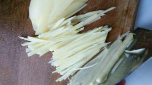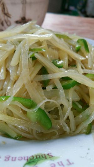 先将土豆切成薄片,然后切成丝(注意刀工,小心伤手)