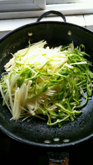 待油面冒出烟,将切好的青椒丝土豆丝一齐倒入油锅