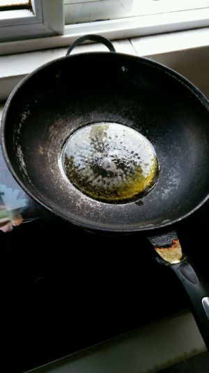 将火打开,倒入三小勺的油(我用的菜籽油,也可用其它的)