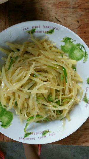 土豆丝炒熟,放鸡精,放白醋两勺翻炒均匀起锅。洒葱末点缀。