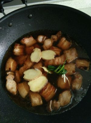 花肉和糖色翻炒一分钟左右上色!后加水盖过肉面一点点,加姜片,葱结,生抽一起煮。。。大火煮开小火加盖煮40~60分钟!