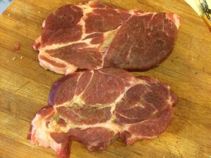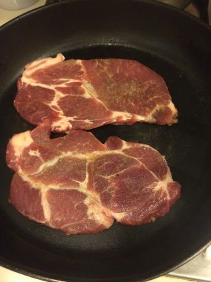 2片猪颈肉, 洗净沥干, 两面抹garlic salt腌2-4个小时入味,看图二
