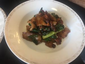 加入之前煎好的五花肉,加入适量生抽、白糖调味,起锅前淋少许水淀粉炒匀。