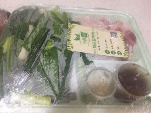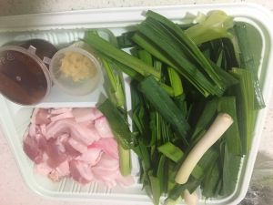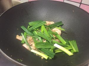 热油加蒜瓣,一片片以筷子铺陈五花肉;导入包装盒里的姜蓉一齐炒;肉略熟后放入蒜苗,翻炒,然后加入包装盒调好的微辣酱汁(内含豉油豆瓣酱)
