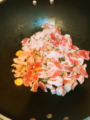 加入少量花生油,把五花肉和姜片、花椒放入锅中煎香,待肉两面金黄后捞出,油留锅底。