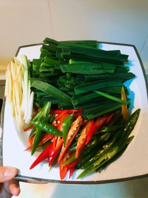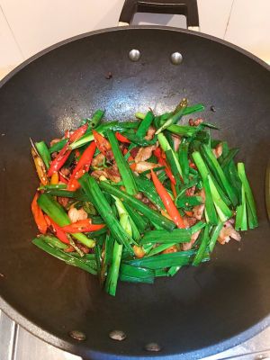 加入准备好的红绿尖椒、姜丝、蒜苗翻炒均匀,不要炒太久,蒜苗容易老,炒配菜的时候加入一点点盐,以便入味。