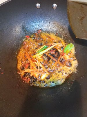 把准备的姜丝、葱段、豆豉、豆瓣酱放入锅中翻炒片刻。