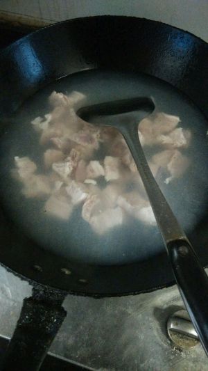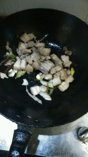 用油起锅,倒入五花肉,翻炒至转色和出油