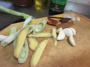 准备配料,葱姜蒜,料酒,冰糖,酱油等备用