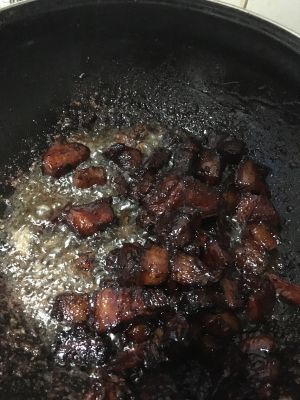将切好的五花肉放入锅中,小火慢炒,将肉中的油水煸炒出来,这一步骤要有耐心,慢慢炒,一直到没有油水炒出为止,这样吃起来不会很油腻