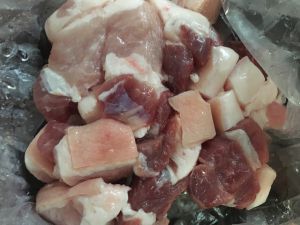 五花肉切成2.5*2.5见方的块,我是用水略煮下切的,这样比较好切。