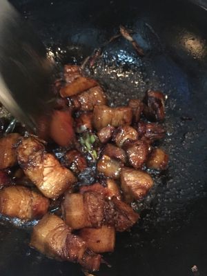 将五花肉捞出控水,锅内放入适量色拉油,将五花肉放入锅中,加入冰糖、葱、姜蒜、辣椒等,进行翻炒,使五花肉均匀包裹上焦,待冰糖充分包裹上焦后,放入生抽、老抽上色。之后倒入锅中适量开水,没过肉面即可,不要太多,小火炖约30分钟左右。