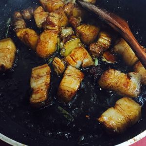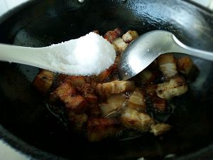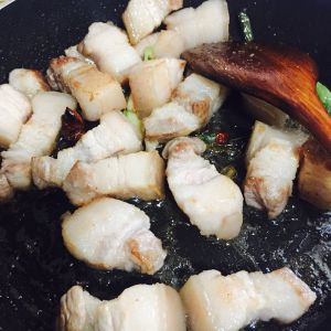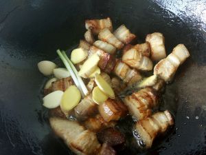 油热后冰糖下锅,待融化变色,放入五花肉爆炒,待肉出油后放备好的辅料,爆香。