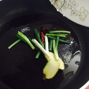 葱姜蒜八角干辣椒下锅爆香。不要放太多油。