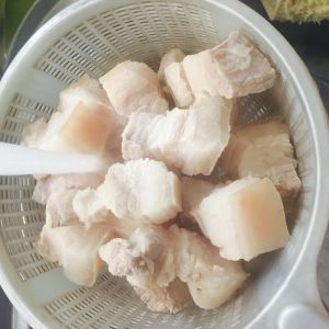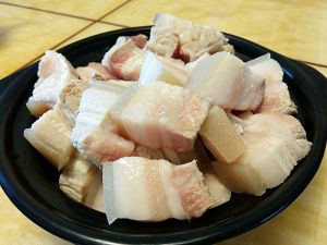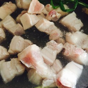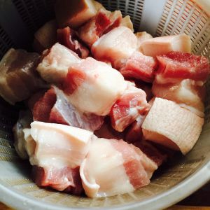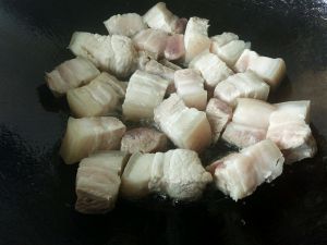 五花肉切块,然后开水下锅煮熟,沥干水分备用