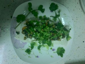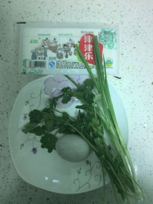 把豆腐均匀的切片,皮蛋切碎后均匀的放在豆腐上,撒上少许盐和香菜和葱花。