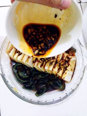 豆腐表面摸一层薄盐,摆上切好的榨菜和皮蛋,浇上放凉的辣椒油,放入用糖,醋,鲜酱油调好的酱汁。