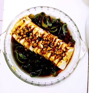 内脂豆腐扣入盘中.皮蛋拨壳.用开水烫一下.