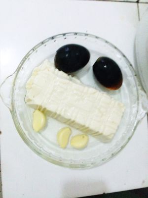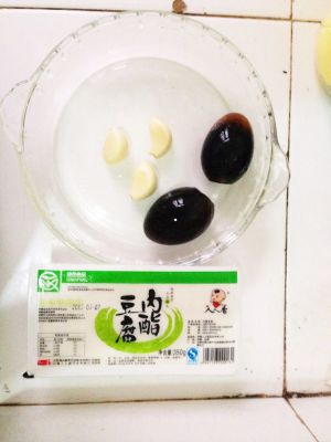 准备内脂豆腐一盒.皮蛋两个.蒜瓣几个.